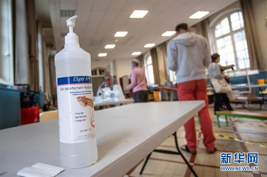 这是6月28日在法国巴黎一家投票站拍摄的消毒免洗洗手液。 当日,法国举行市镇选举第二轮投票。受新冠肺炎疫情影响,本轮投票由原定的3月22日推迟至6月28日举行。 新华社发(奥雷利安·莫里萨尔摄)