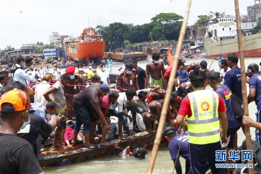 孟加拉国首都达卡布里甘加河水域29日上午发生沉船事故,搭载50至60名乘客的渡船与另一艘渡船相撞后沉没,救援人员现已打捞起24具遇难者遗体。 新华社发