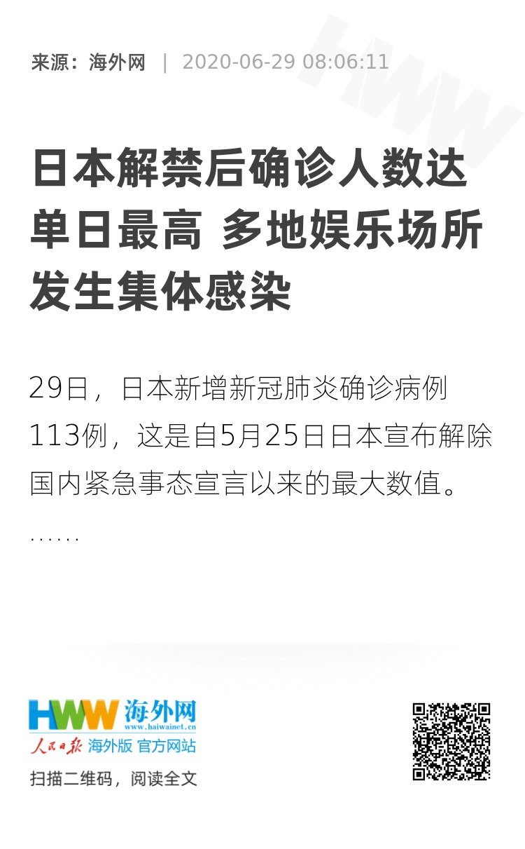海外网6月29日电 29日,日本新增新冠肺炎确诊病例113例,这是自5月25日日本宣布解除国内紧急事态宣言以来的最大数值。至此,包括“钻石”号邮轮在内的确诊患者,日本的确诊病例达19234人,死者共985人。