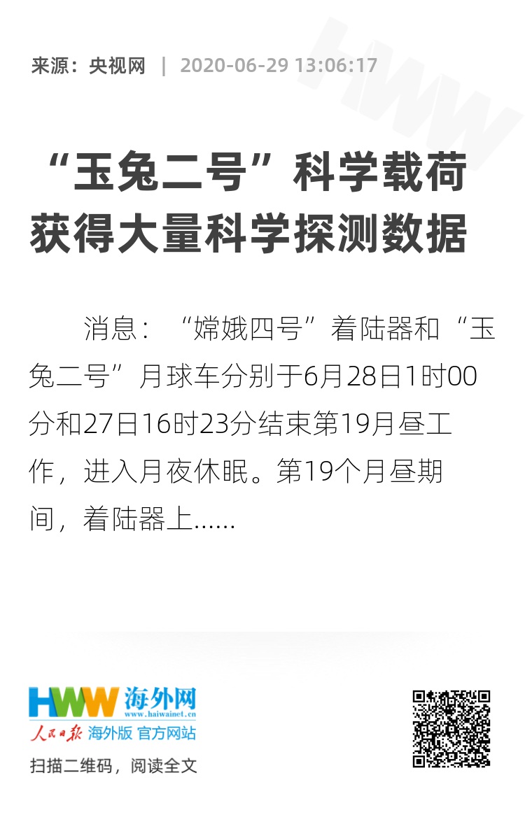 央视网消息:“嫦娥四号”着陆器和“玉兔二号”月球车分别于6月28日1时00分和27日16时23分结束第19月昼工作,进入月夜休眠。第19个月昼期间,着陆器上月球中子及辐射剂量探测仪、低频射电频谱仪按计划开机工作,开展了常规科学探测。