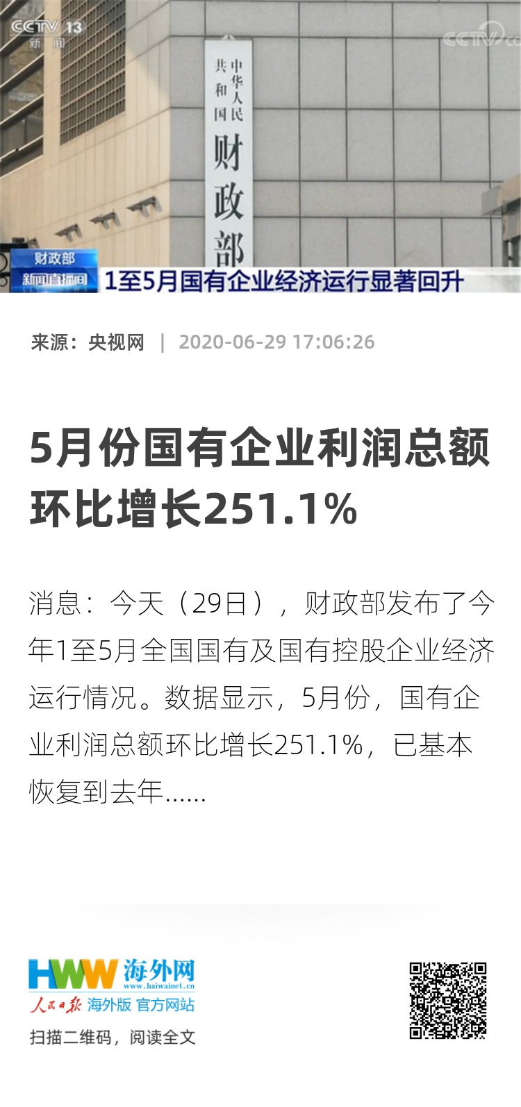 数据显示,5月份,国有企业利润总额环比增长251.1%,已基本恢复到去年同期水平。1至5月主要经济效益指标同比降幅收窄,运行显著回升。