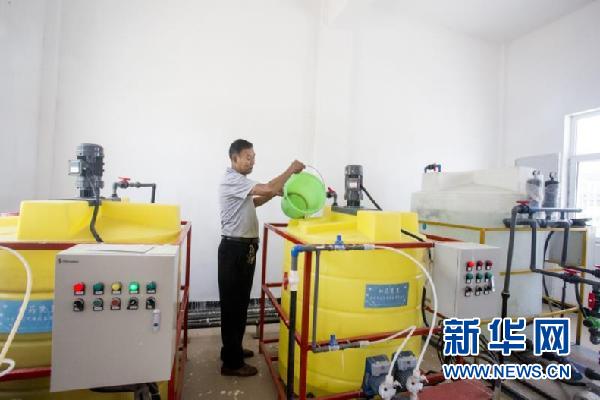 工作人员在污水处理工艺中添加药液。庄浪县委宣传部 供图
