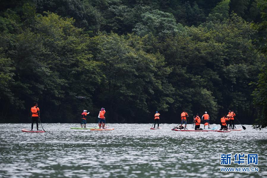 6月28日,水上运动爱好者在杭州市富阳区湖源乡的壶源溪上体验桨板运动的乐趣。 近期,浙江省杭州市富阳区场口镇、常安镇和湖源乡组团开启了一场夏季“绿水青山嘉年华”。这几个壶源溪流域乡镇整合生态旅游资源,组团开发山村旅游项目,游客可以参与壶源溪水上游乐、露营永安山顶、特色农产品集市和瓜果节等特色活动。 新华社记者 徐昱 摄