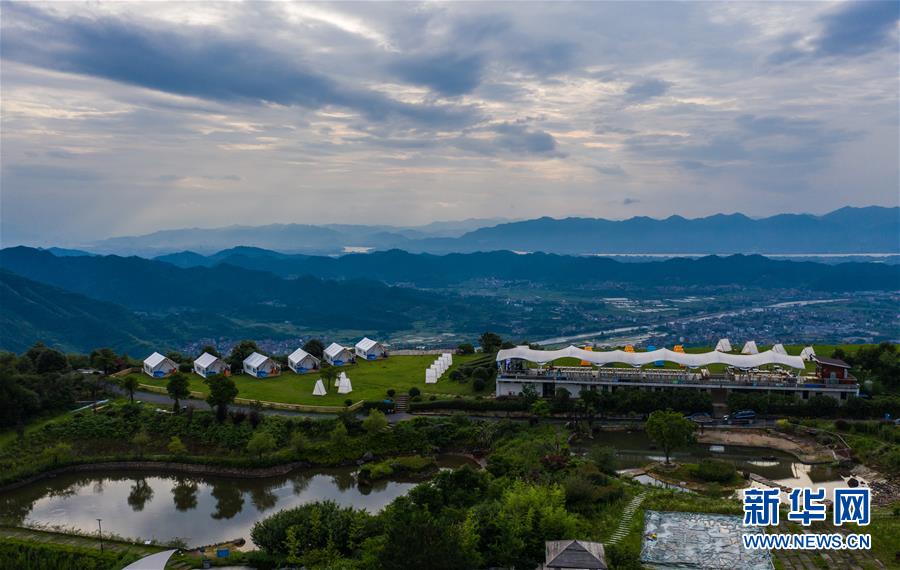 空中俯瞰杭州市富阳区常安镇永安山顶的帐篷酒店(6月27日摄,无人机照片)。 近期,浙江省杭州市富阳区场口镇、常安镇和湖源乡组团开启了一场夏季“绿水青山嘉年华”。这几个壶源溪流域乡镇整合生态旅游资源,组团开发山村旅游项目,游客可以参与壶源溪水上游乐、露营永安山顶、特色农产品集市和瓜果节等特色活动。 新华社记者 徐昱 摄