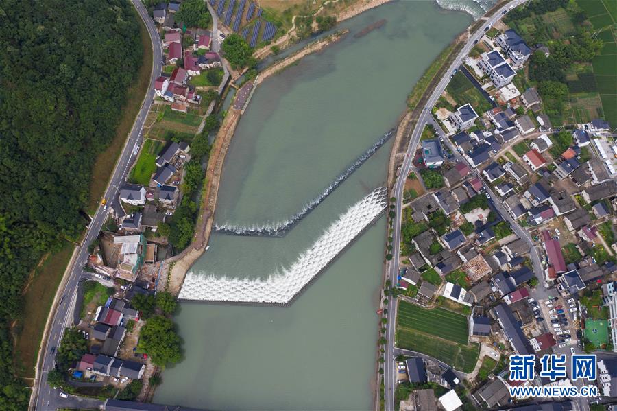 空中俯瞰杭州市富阳区湖源乡的龙鳞坝(6月28日摄,无人机照片)。 近期,浙江省杭州市富阳区场口镇、常安镇和湖源乡组团开启了一场夏季“绿水青山嘉年华”。这几个壶源溪流域乡镇整合生态旅游资源,组团开发山村旅游项目,游客可以参与壶源溪水上游乐、露营永安山顶、特色农产品集市和瓜果节等特色活动。 新华社记者 徐昱 摄