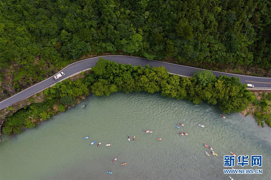 水上运动爱好者在杭州市富阳区湖源乡的壶源溪上体验桨板运动的乐趣(6月28日摄,无人机照片)。 近期,浙江省杭州市富阳区场口镇、常安镇和湖源乡组团开启了一场夏季“绿水青山嘉年华”。这几个壶源溪流域乡镇整合生态旅游资源,组团开发山村旅游项目,游客可以参与壶源溪水上游乐、露营永安山顶、特色农产品集市和瓜果节等特色活动。 新华社记者 徐昱 摄