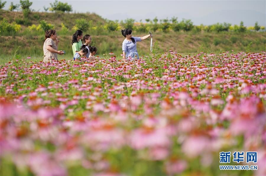 6月27日,游客在内丘县扁鹊药谷中药材种植基地拍照游玩。 近年来,河北省内丘县依托当地山地丘陵地理优势,结合市场需求,引导农民发展黑心金光菊、桔梗、黄芩等中药材种植,打造规模化中药材种植示范园区,推进农业与乡村旅游相融合,有效带动农业增效、农民增收。 新华社记者 朱旭东 摄