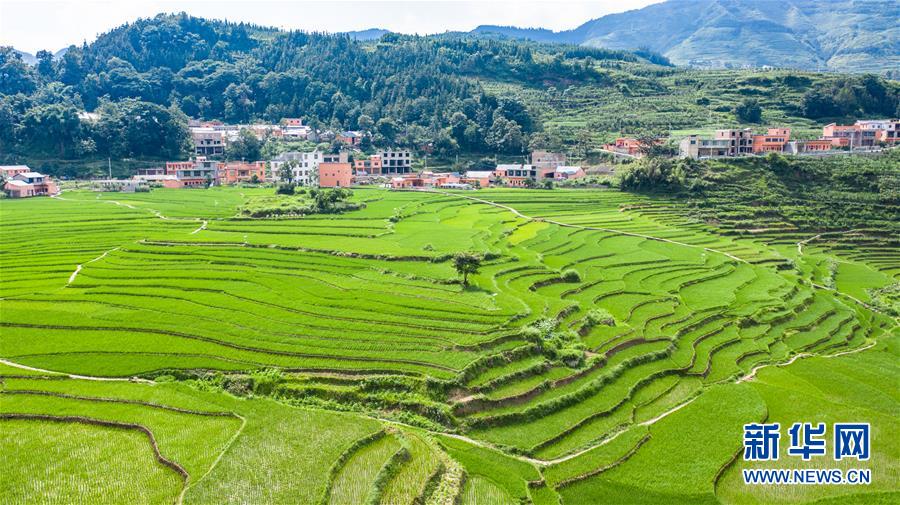 贵州省盘州市新民镇的梯田风光(6月29日摄,无人机照片)。 夏日时节,贵州省盘州市新民镇的梯田风景如画。 新华社记者 陶亮 摄