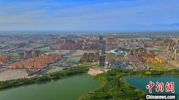 航拍夏日甘肃戈壁小城:半边湖水半边城