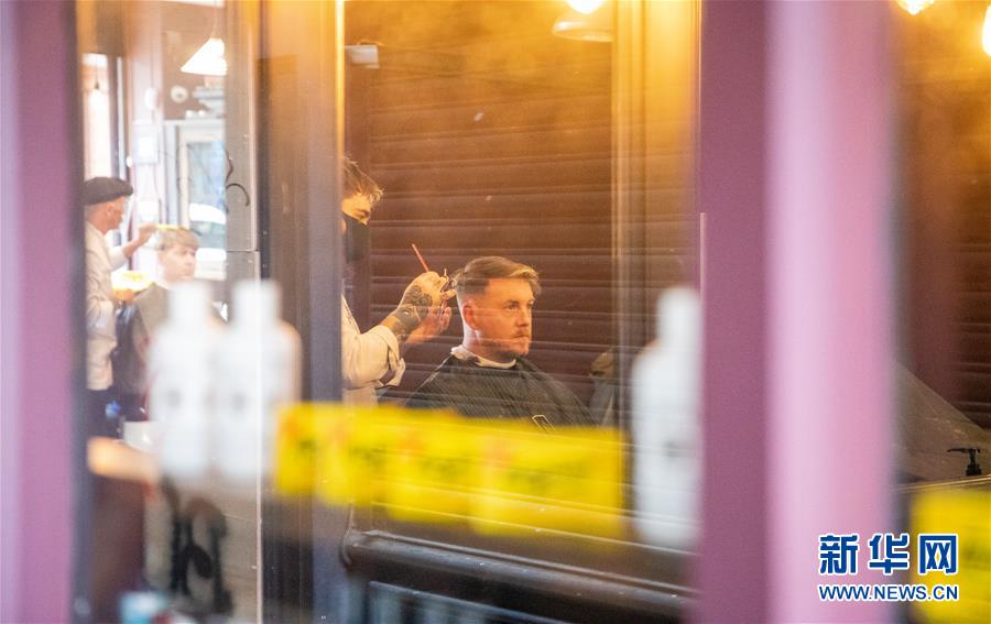 6月29日,一名男子在爱尔兰都柏林一家恢复营业的理发店理发。 爱尔兰29日如期进入社会经济重启第三阶段,又一批商业和服务设施恢复营业,人们的活动空间再度扩大。但卫生专家指出,当前疫情形势出现了一些苗头性问题,民众的防控意识不可松懈。 新华社发
