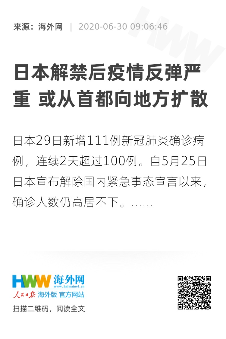 海外网6月30日电 日本29日新增111例新冠肺炎确诊病例,连续2天超过100例。自5月25日日本宣布解除国内紧急事态宣言以来,确诊人数仍高居不下,目前呈现以东京为中心,全国确诊患者持续增加的态势。人们在东京聚餐,之后上班、回家,将疫情扩散至外县,这样的案例不断增加,引发日本专家警惕。