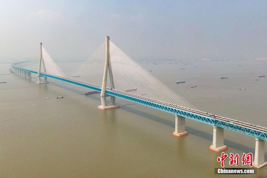6月30日,航拍即将通车的沪苏通长江公铁大桥。该桥横跨长江,两岸连接江苏省南通市和张家港市,公铁合建跨江正桥全长5827米,主航道桥主跨1092米,为国内最大跨度斜拉桥,也是世界最大跨度公铁两用斜拉桥。(无人机拍摄) 中新社记者 泱波 摄