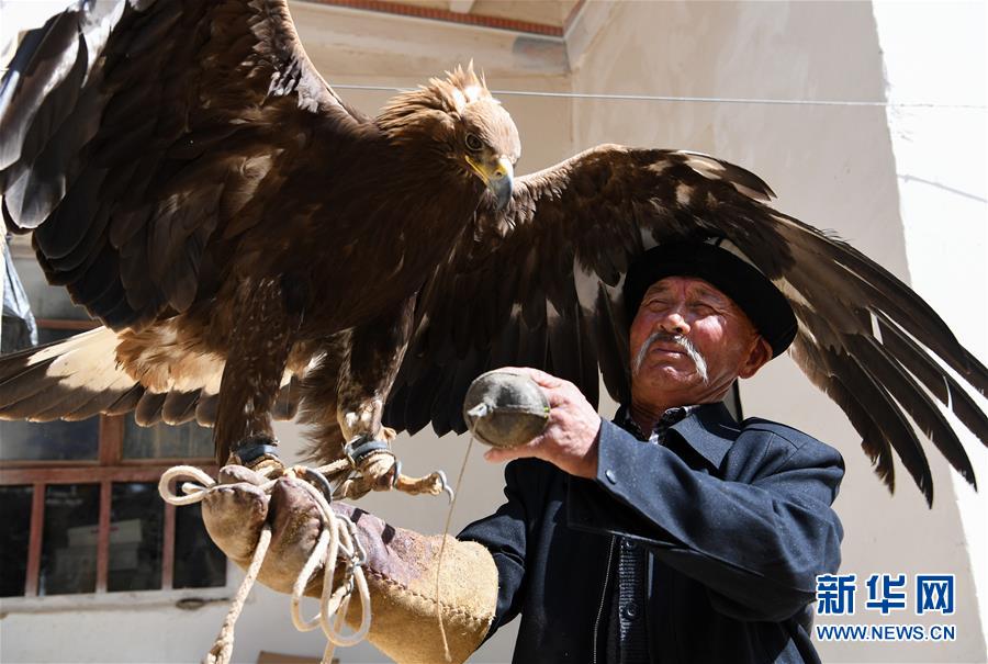6月27日,库尔马西·胡特曼取下猎鹰的眼罩。驯鹰人平时会给猎鹰戴上眼罩,一般只有在猎鹰进食、捕猎的时候才会取下。 新华社记者 宋彦桦 摄