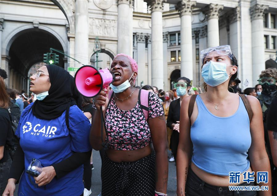 6月30日,人们在美国纽约市政厅附近参加抗议活动。 由美国明尼苏达州明尼阿波利斯市非裔男子弗洛伊德遭白人警察暴力执法而死一事引发的各种抗议活动仍在纽约持续进行。 新华社记者 王迎 摄