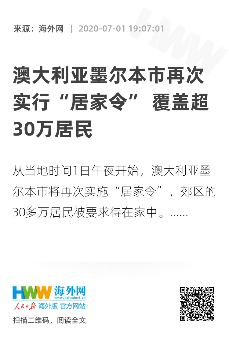 海外网7月1日电 从当地时间1日午夜开始,澳大利亚墨尔本市将再次实施“居家令”,郊区的30多万居民被要求待在家中,原因是该市所在的维多利亚州的新冠肺炎疫情出现反弹,已经连续两天报告新增超70例确诊病例。