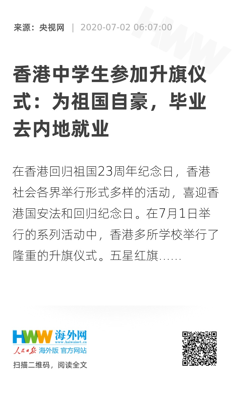 在香港回归祖国23周年纪念日,香港社会各界举行形式多样的活动,喜迎香港国安法和回归纪念日。在7月1日举行的系列活动中,香港多所学校举行了隆重的升旗仪式。五星红旗飘扬在香江两畔,香港社会各界一同庆祝香港国安法的实施和香港回归祖国纪念日。
