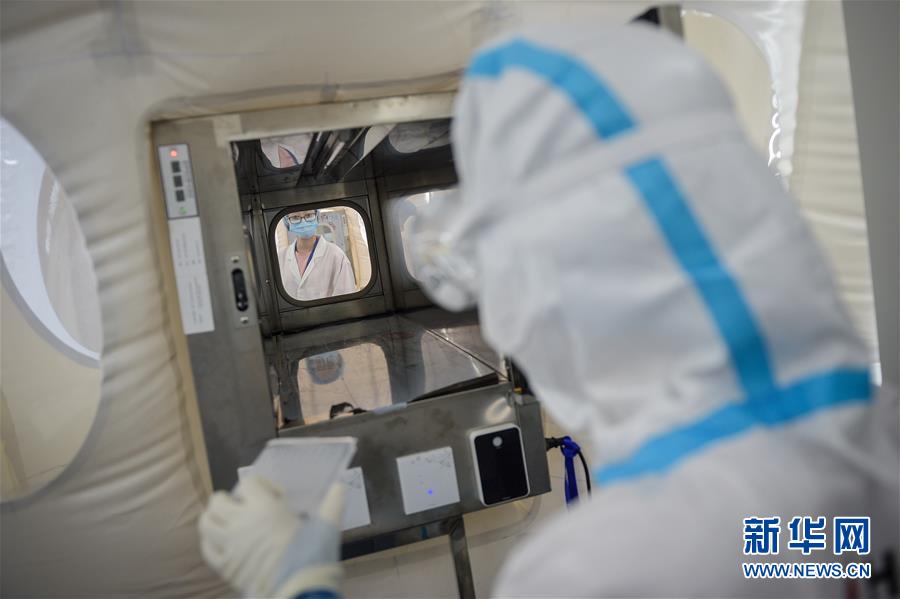 7月1日,在提取实验室内,实验人员(右)通过传递通道将物品转移到扩增实验室。 新华社记者 彭子洋 摄