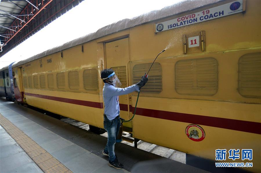 7月1日,在印度新德里东部阿嫩德维哈尔火车站,工作人员为改造成新冠隔离点的火车车厢消毒。 新华社发(帕塔·萨卡尔摄)