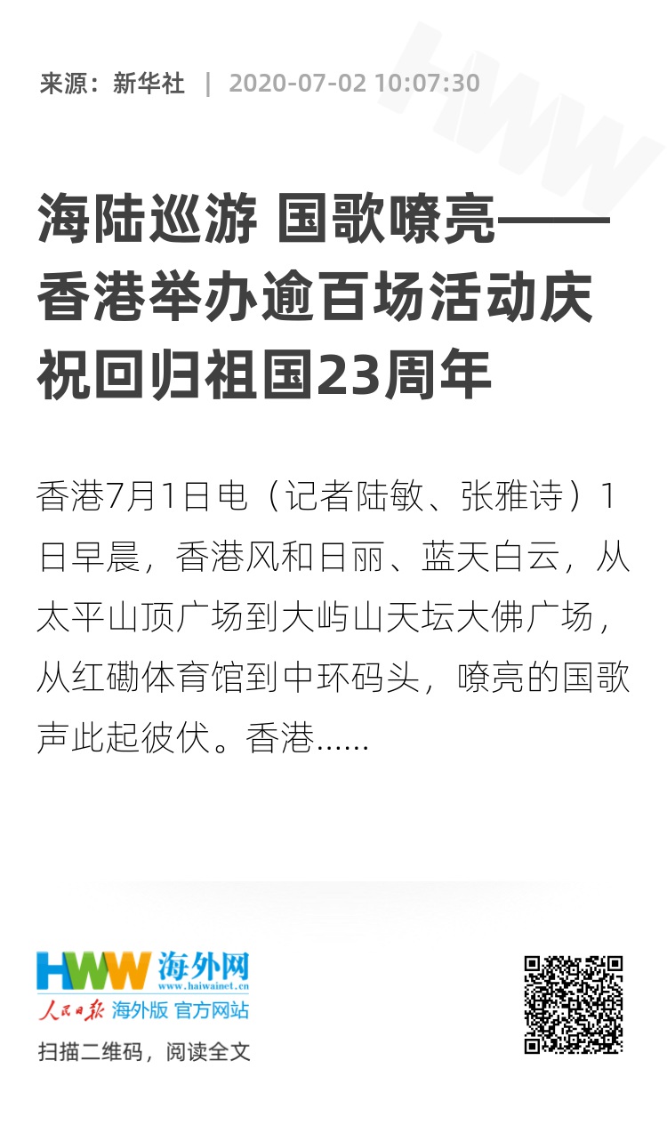 新华社香港7月1日电(记者陆敏、张雅诗)1日早晨,香港风和日丽、蓝天白云,从太平山顶广场到大屿山天坛大佛广场,从红磡体育馆到中环码头,嘹亮的国歌声此起彼伏。香港的大街小巷旗幅飘扬,洋溢着喜庆气氛。民众用喜悦的心情庆祝香港回归祖国23周年和香港国安法颁布实施。
