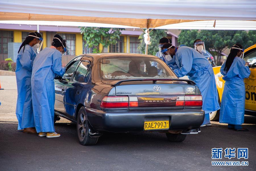 7月2日,医护人员在卢旺达首都基加利为过路车辆内的人员进行新冠病毒检测。新华社发(西里尔·恩德格亚摄)