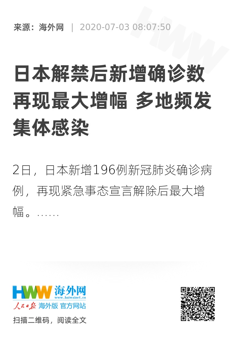 海外网7月3日电 日本2日新增196例新冠肺炎确诊病例,再现紧急事态宣言解除后最大增幅。至此,日本国内的确诊病例累计19035例,加上“钻石公主”号邮轮的确诊病例,共19747例,而新冠肺炎死者累计990例。