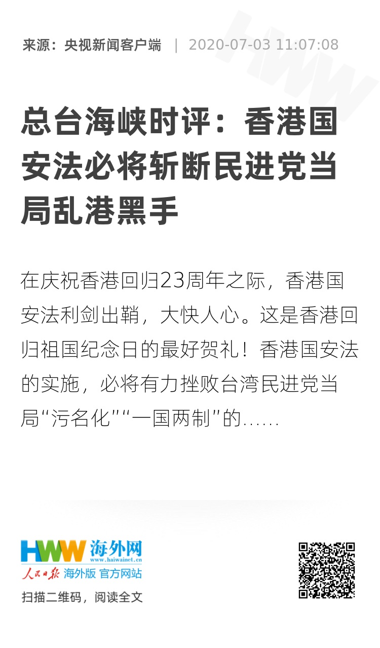 奉劝民进党当局认清大势,收回黑手,弃暗从良。如若死不改悔、图谋不轨,必将遭到香港国安法的严惩。(据中央广播电视总台中华之声)