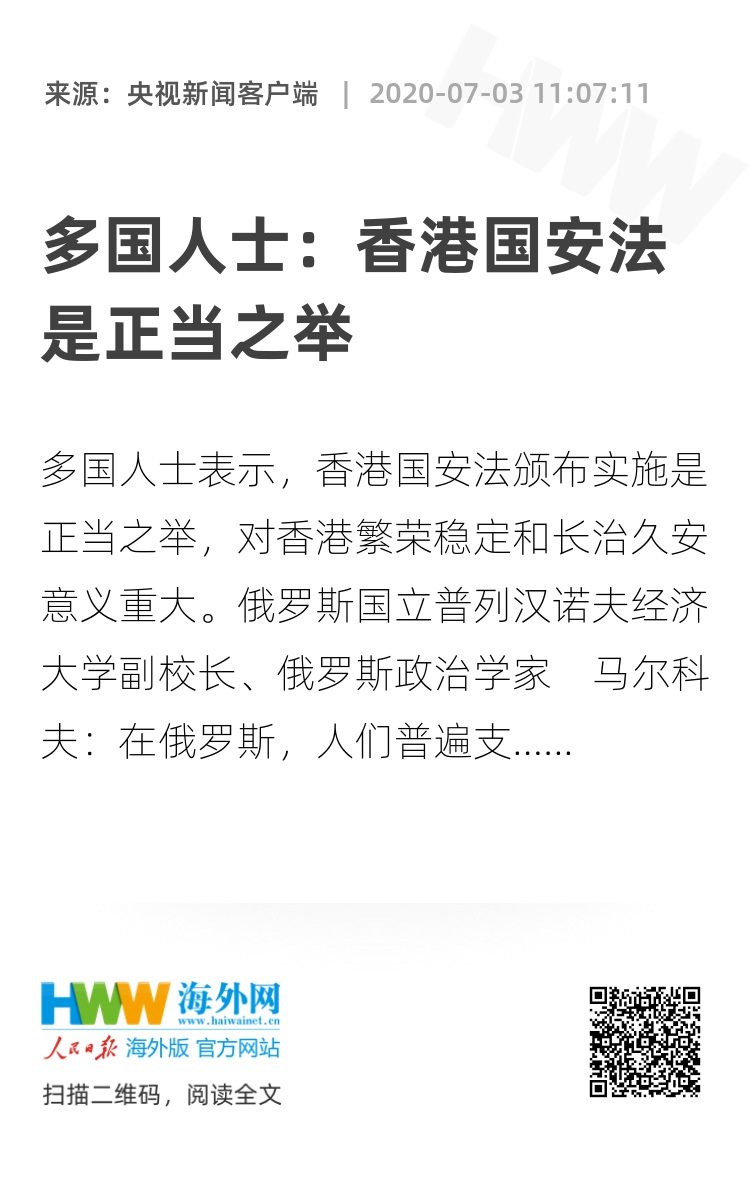 俄罗斯国立普列汉诺夫经济大学副校长、俄罗斯政治学家 马尔科夫:在俄罗斯,人们普遍支持中方制定香港国安法,认为这是果断的举措,有利于维护国家的主权,维护中国内地与香港的关系。中方的行动合法、合理、符合实际,国际社会应当予以支持。