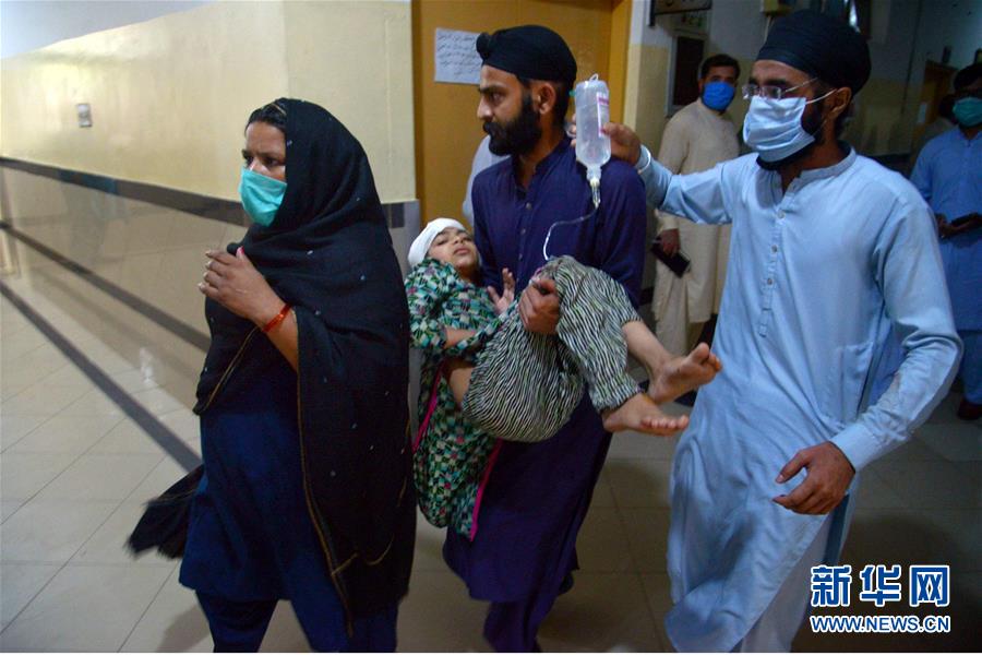 7月3日,在巴基斯坦东部旁遮普省谢赫布拉地区,人们转移一名受伤的儿童。 新华社发