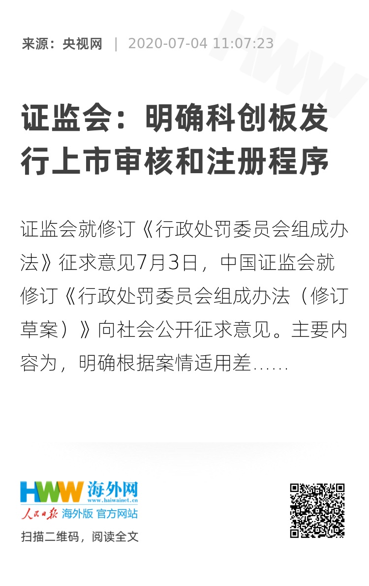 7月3日,中国证监会就修订《行政处罚委员会组成办法(修订草案)》向社会公开征求意见。主要内容为,明确根据案情适用差异化的案件审理程序。既依法保障当事人合法权益,又合理配置审理资源,提高执法效率。完善各层级主体的工作职责。进一步厘清责任,理顺工作流程,提高执法效能。