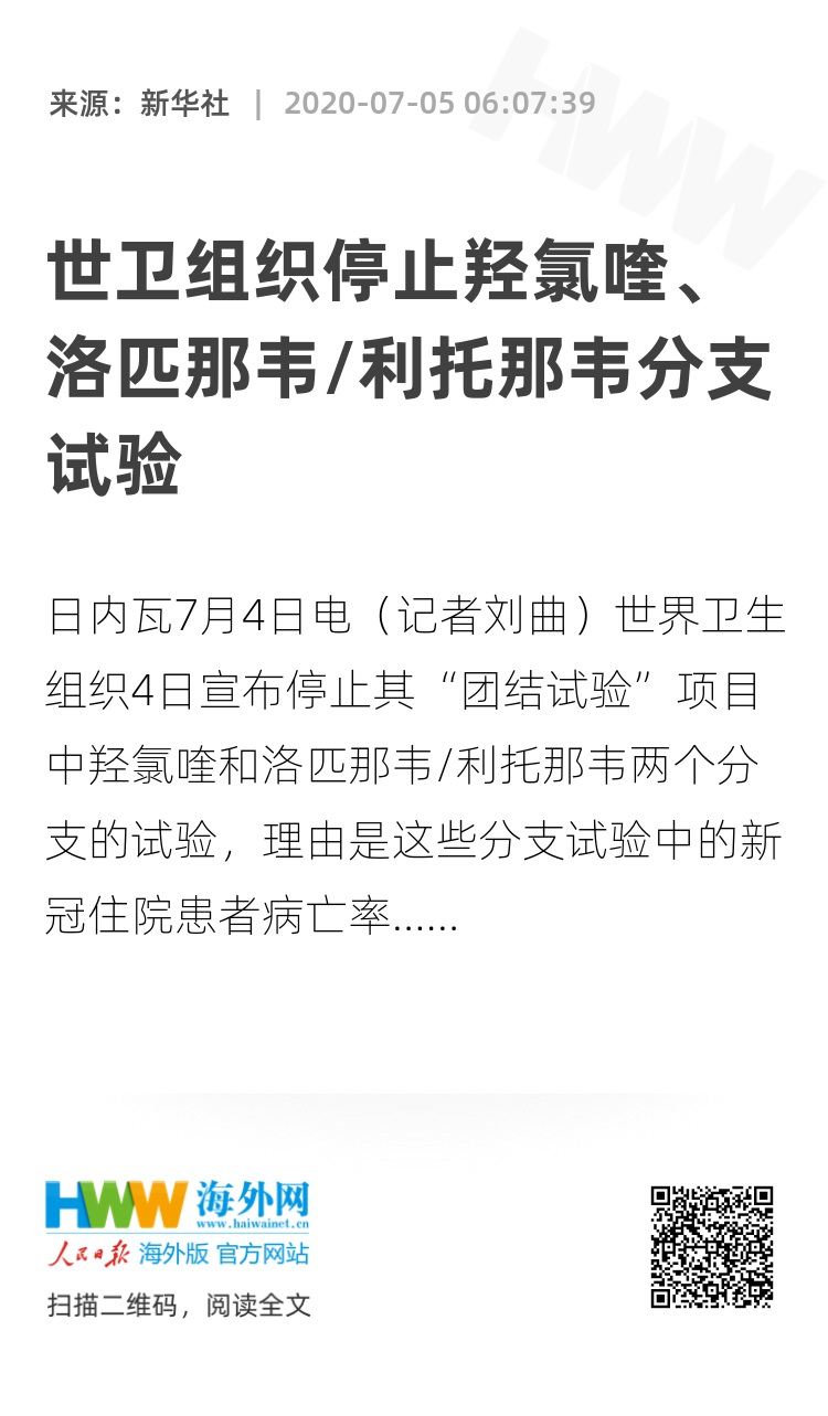 世卫组织强调,这一决定仅适用于针对新冠住院患者的“团结试验”,并不影响其他对非住院患者使用羟氯喹或洛匹那韦/利托那韦的研究评估,或作为新冠暴露前或暴露后预防的评估。