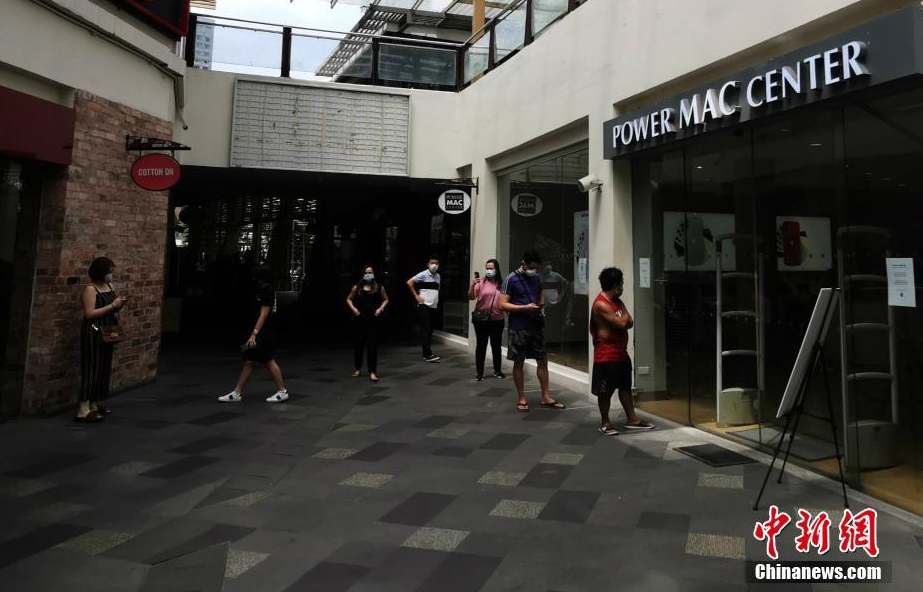7月4日,菲律宾国家抗疫行动第二阶段计划启动后第一个周末,不少顾客排队等候光顾马尼拉CBD马卡蒂绿带的数码产品商店。进入第二阶段计划,马尼拉大部分商业陆续恢复营业。 中新社记者 关向东 摄
