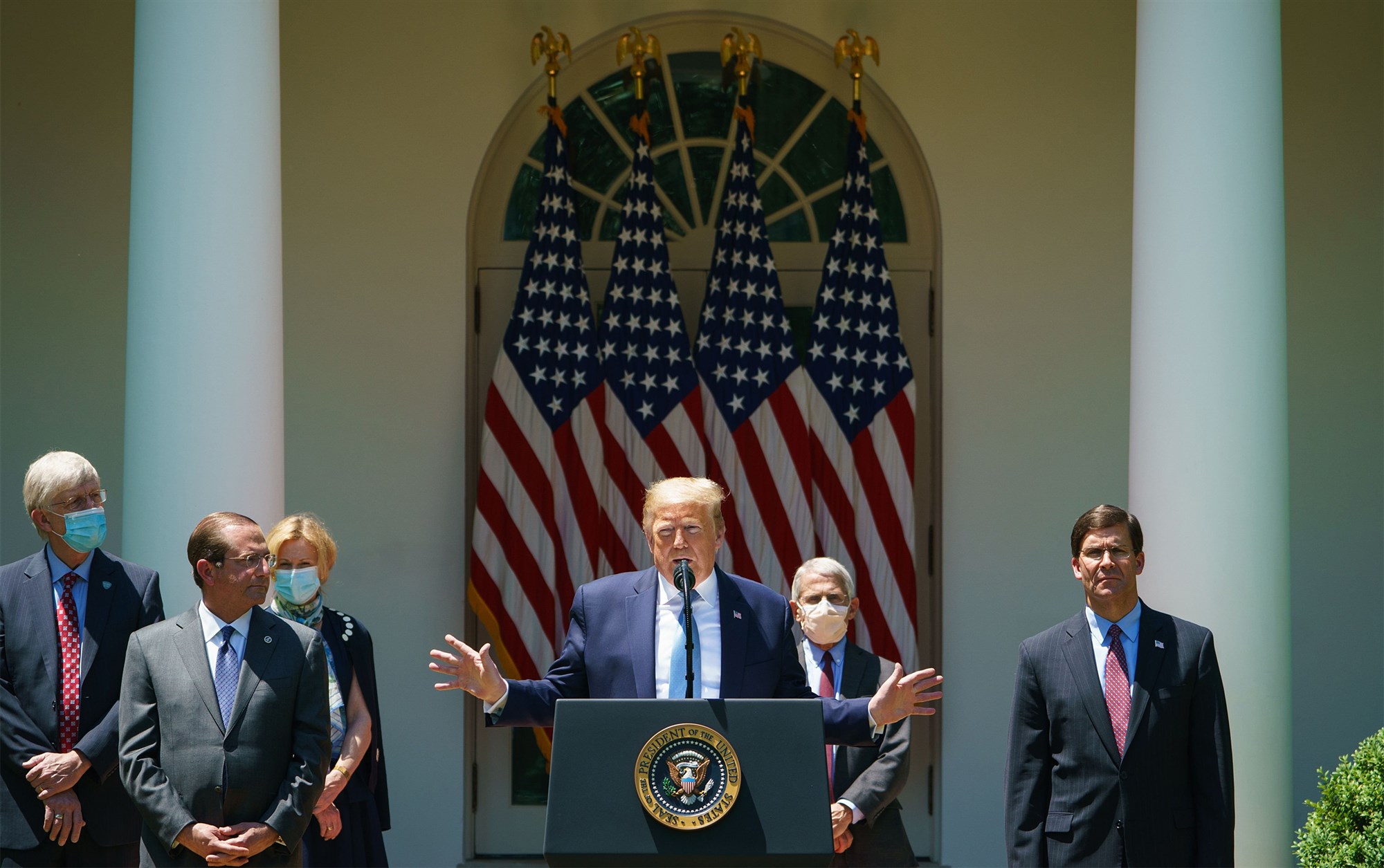资料图:美国政府5月份于玫瑰园介绍疫苗研究情况。(图源:Getty Images)
