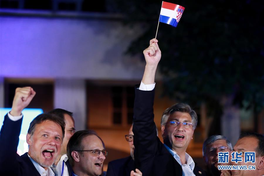 7月5日,克罗地亚总理普连科维奇(中)在萨格勒布庆祝获胜。新华社发(萨宁摄)