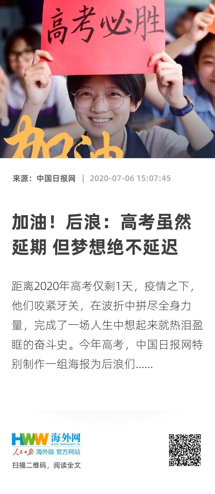 距离2020年高考仅剩1天,疫情之下,他们咬紧牙关,在波折中拼尽全身力量,完成了一场人生中想起来就热泪盈眶的奋斗史。今年高考,中国日报网特别制作一组海报为后浪们加油!愿你们以渺小启程,以伟大结束。