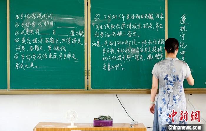 江西省泰和县泰和二中考点,考务人员正在按要求布置考场。 谢子洋 摄