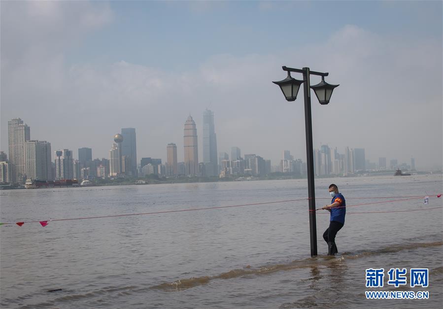 7月6日,工作人员在武昌江滩上拉警戒线。  新华社记者 肖艺九 摄