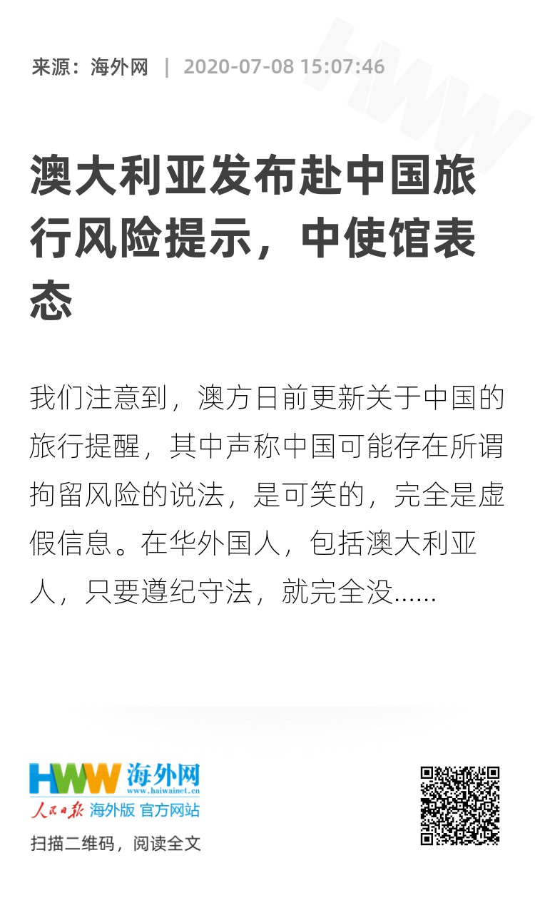我们注意到,澳方日前更新关于中国的旅行提醒,其中声称中国可能存在所谓拘留风险的说法,是可笑的,完全是虚假信息。在华外国人,包括澳大利亚人,只要遵纪守法,就完全没有必要担心。当然,从事诸如贩卖毒品、间谍等违法活动的,都会像在其他国家一样,依法受到处理。