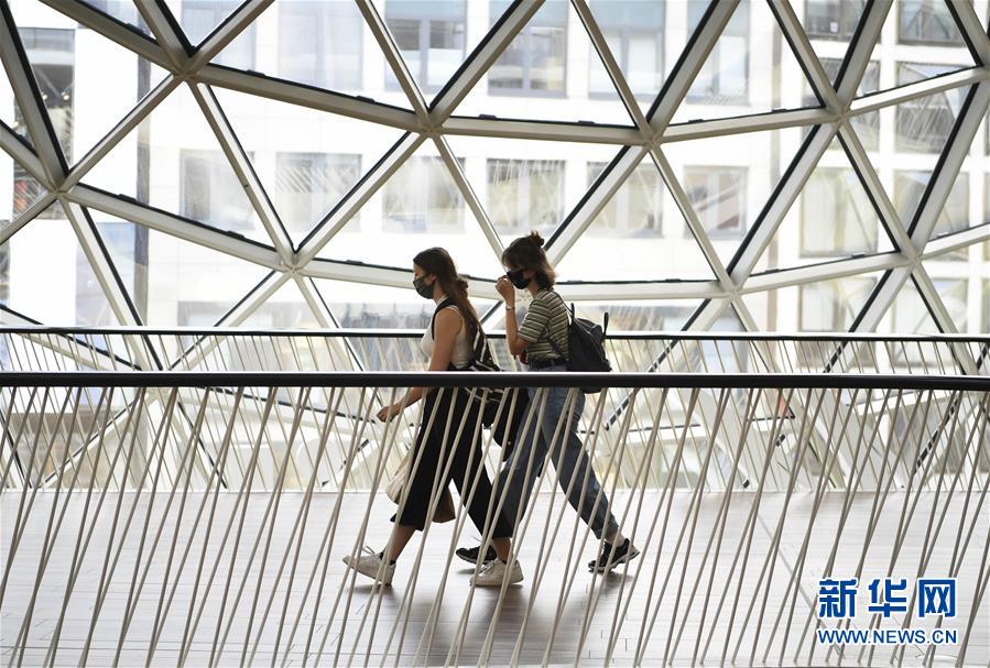7月7日,在德国法兰克福,戴口罩的女子从一家商场内走过。 针对有地方官员呼吁取消民众乘坐公交车和在商场购物时须戴口罩的规定,德国联邦政府6日表示,支持延续“口罩强制令”。 新华社记者逯阳摄