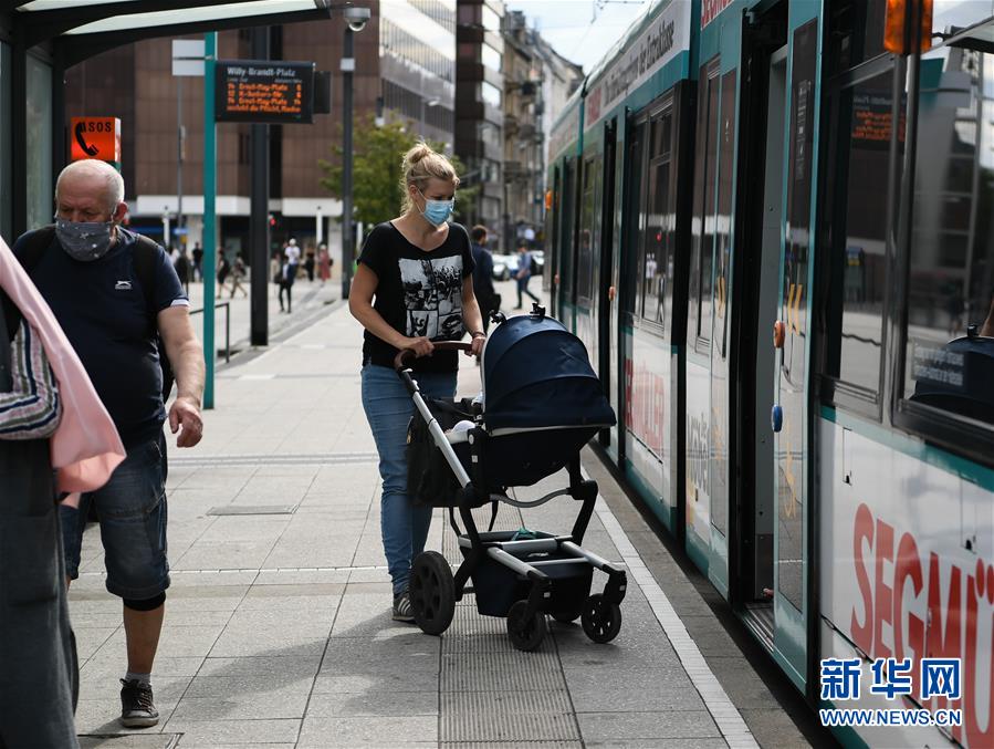 7月7日,在德国法兰克福,一名戴口罩的女子准备搭乘电车。 针对有地方官员呼吁取消民众乘坐公交车和在商场购物时须戴口罩的规定,德国联邦政府6日表示,支持延续“口罩强制令”。 新华社记者逯阳摄