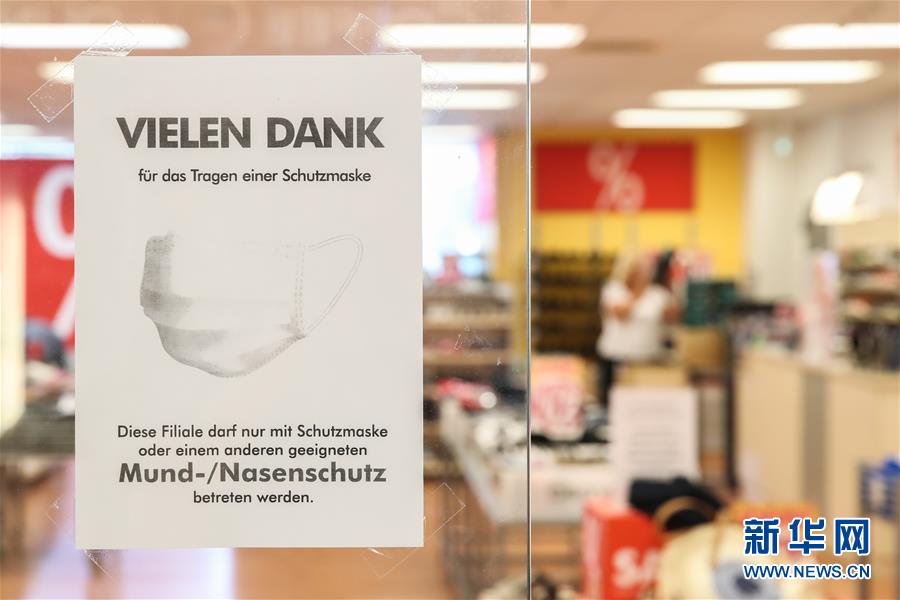 这是7月7日在德国首都柏林拍摄的一间商铺张贴着提示顾客佩戴口罩的告示。 针对有地方官员呼吁取消民众乘坐公交车和在商场购物时须戴口罩的规定,德国联邦政府6日表示,支持延续“口罩强制令”。4月底,德国全部16个联邦州陆续出台“口罩强制令”,即居民在乘坐公交车和购物时须佩戴口罩。 新华社记者 单宇琦 摄