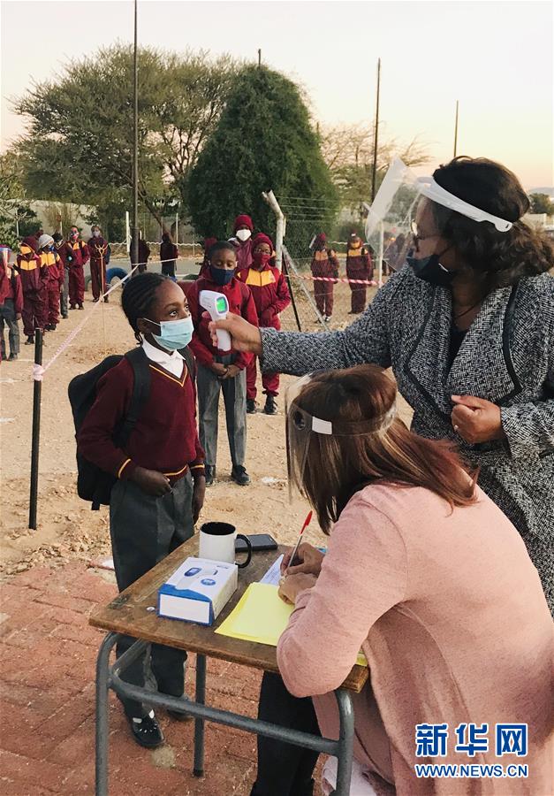 7月7日,在纳米比亚首都温得和克,小学生进入校园前排队接受体温检测。 纳米比亚小学生从7日起开始恢复到校上课。 新华社发(伊塔摄)
