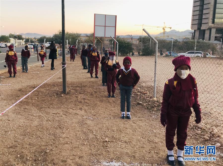 7月7日,在纳米比亚首都温得和克,小学生进入校园前排队等待体温检测。 纳米比亚小学生从7日起开始恢复到校上课。 新华社发(伊塔摄)