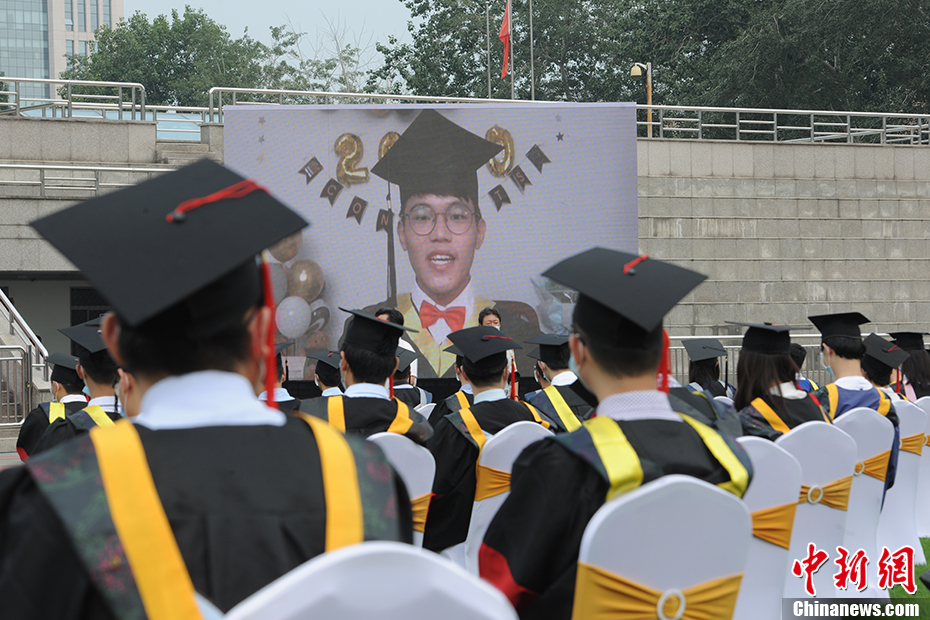 图为毕业典礼上,非在校毕业生通过大屏幕参加毕业典礼。中新网记者 李骏 摄
