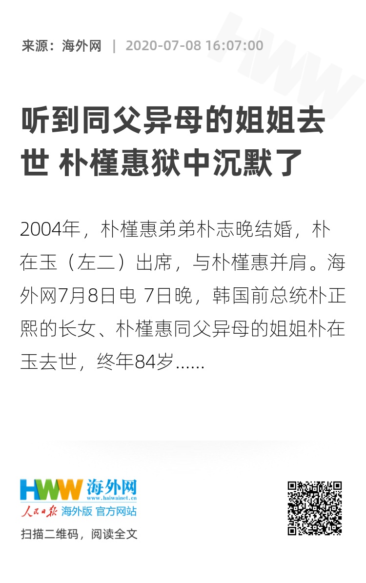 海外网7月8日电 7日晚,韩国前总统朴正熙的长女、朴槿惠同父异母的姐姐朴在玉去世,终年84岁。葬礼计划10日举行。韩国舆论普遍猜测,身在监狱的朴槿惠会申请吊唁姐姐。然而,当被告知这一消息后,朴槿惠的反应有些沉默。