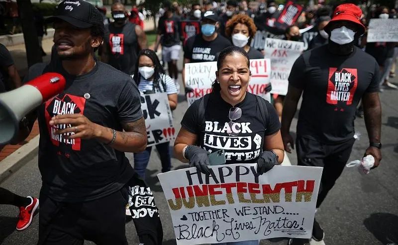 △美国民众身穿印有“黑人的命也是命”标语的衣服参加游行