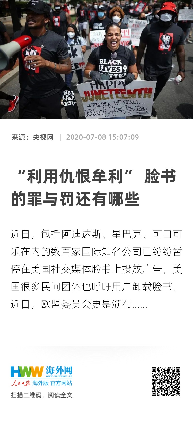 事情要从一个多月前说起。自美国非洲裔男子乔治·弗洛伊德死于白人警察暴力执法后,全美各地掀起了声势浩大的“黑人的命也是命”抗议运动。脸书等社交媒体也随之成了人们在街头之外的第二个表达“场所”。