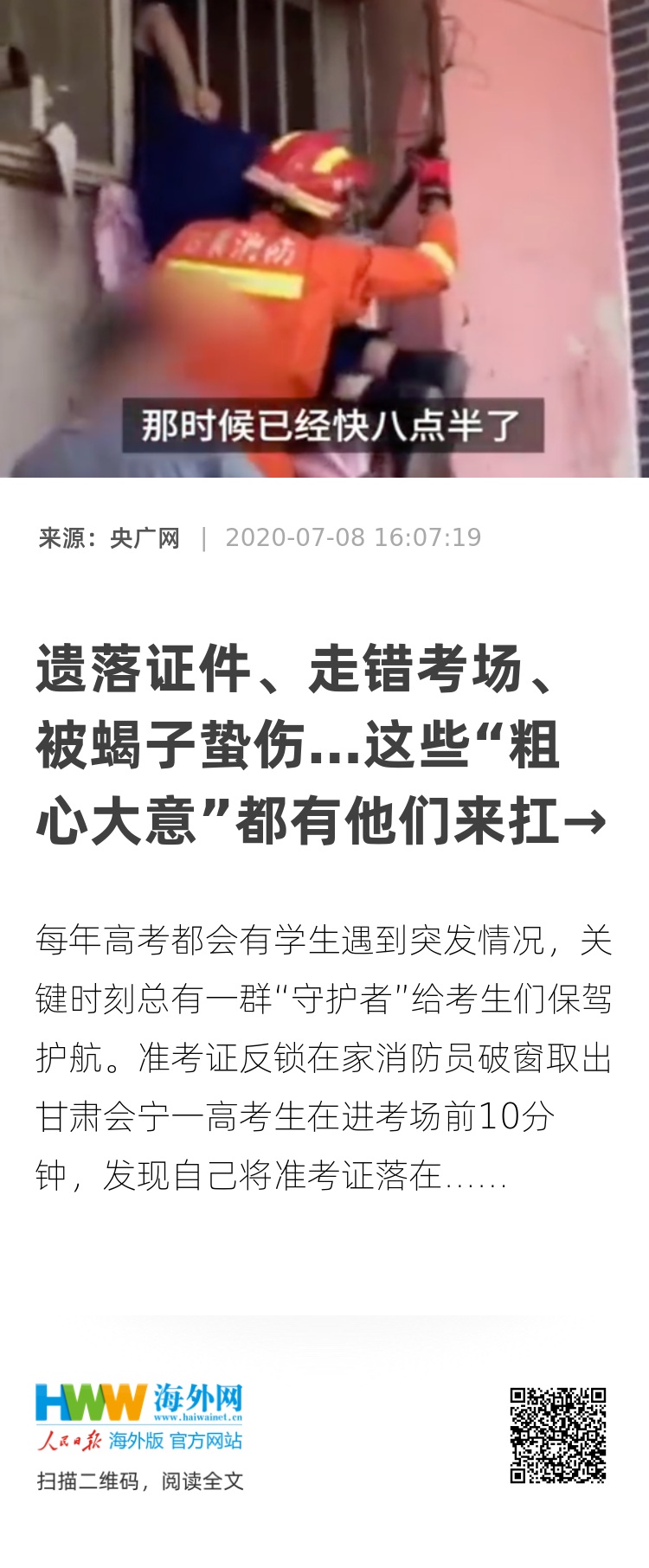 甘肃会宁一高考生在进考场前10分钟,发现自己将准考证落在家中,便和母亲回家拿,又发现母亲把钥匙锁在家里,于是赶紧向消防队求助。