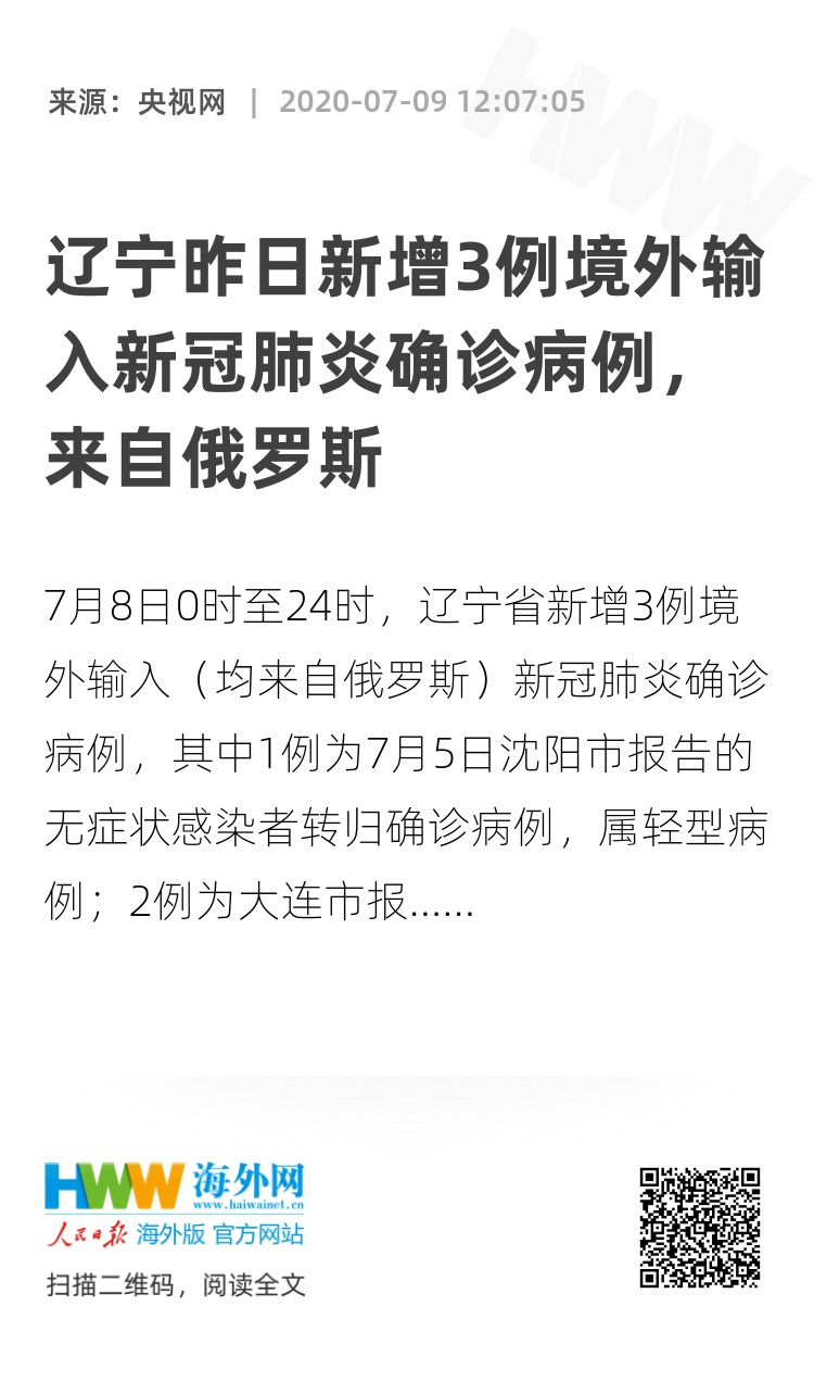 7月8日0时至24时,辽宁省新增3例境外输入(均来自俄罗斯)新冠肺炎确诊病例,其中1例为7月5日沈阳市报告的无症状感染者转归确诊病例,属轻型病例;2例为大连市报告病例,均为俄罗斯籍船员,均属普通型病例。新增无症状感染者1例(境外输入,俄罗斯籍船员),为大连市报告病例。无新增治愈出院病例。