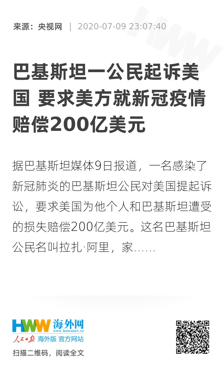 这名巴基斯坦公民名叫拉扎·阿里,家住拉合尔,最近刚从新冠病毒感染中康复。他在法庭上对美国驻拉合尔总领事、美国驻巴基斯坦大使馆、美国总统等发起诉讼。他表示,新冠肺炎在全世界大流行,美国负有不可推卸的责任。他说,数月以来,美国领导层一直在淡化疫情的严重性,不顾世界卫生组织的警告,在媒体上不断谎报和隐瞒本国疫情,并指责他人。由于美国领导人不负责任的言论和应对疫情不力,使得疫情在全世界蔓延。