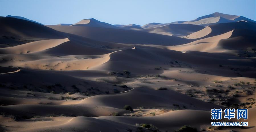 这是7月8日拍摄的腾格里沙漠风光。 位于内蒙古自治区阿拉善左旗西南部和甘肃省中部边境的腾格里沙漠是我国第四大沙漠,总面积约为4.3万平方公里。夏日傍晚,腾格里沙漠连绵的沙丘被日光勾勒出美丽的线条,美不胜收。 新华社记者 连振 摄